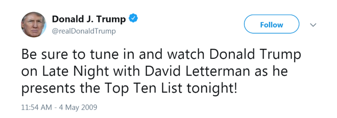 Donald J. Trump’s first foray on to Twitter was part of a promotional campaign for the season finale of the TV show Celebrity Apprentice. 2,819 days later, @realDonaldTrump would be inaugurated forty-fifth president of the United States. (Donald J. Trump/Twitter)
