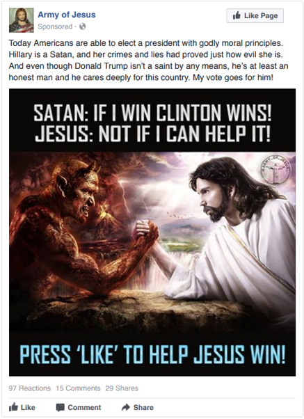 Russian operatives also built popular Facebook groups, buying ads to extend their reach. The overall campaign reached 147 million Americans. Leveraging Facebook’s sophisticated audience engagement tools, this particular ad targeted users whom the algorithms had identified as interested in “Christianity, Jesus, Ron Paul, and Bill O’Reilly.” (U.S. House Permanent Select Committee on Intelligence)