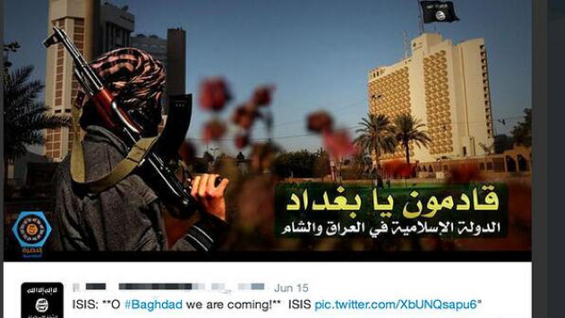 Social media proved integral to the rise of ISIS and its surprising military successes. Here, in a tweet that went viral during its 2014 invasion of Iraq, an ISIS fighter and flag are superimposed on images of Iraq’s capital city (Twitter via PBS).