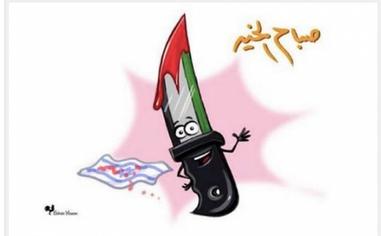 In contrast to the centralized approach of the IDF, Hamas propaganda is produced by a global network of proxies and supporters. This grisly image—an anthromorphized knife saying “good morning” and wrapped in the colors of the Palestinian flag—was released amidst a spate of stabbing attacks targeting Israeli civilians in 2015.