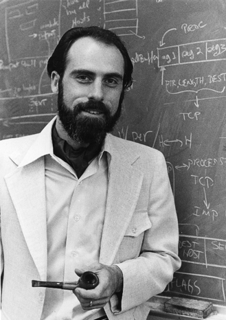 Known as the “Godfather of the Internet,” Vint Cerf poses before the calculations for the protocol he helped establish in 1973, which enabled the early computer networks to knit together into a single system. Online communication could now grow to limitless size and complexity. (Jose Mercado/Stanford News Service)